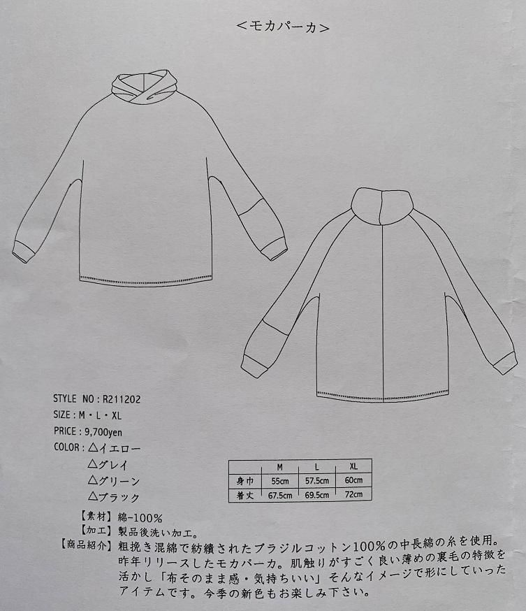 (STYLE NO)R211202 (素材)綿100% (加工)製品後洗い加工。 (remillaさんより) 粗挽き混綿で紡績されたブラジルコットン100%の中長綿の糸を使用。 昨年リリースしたモカパーカ。肌触りがすごく良い薄めの裏毛の特徴を活かし「布そのまま感・気持ちいい」そんなイメージで形にしていったアイテムです。今季の新色もお楽しみ下さい。
