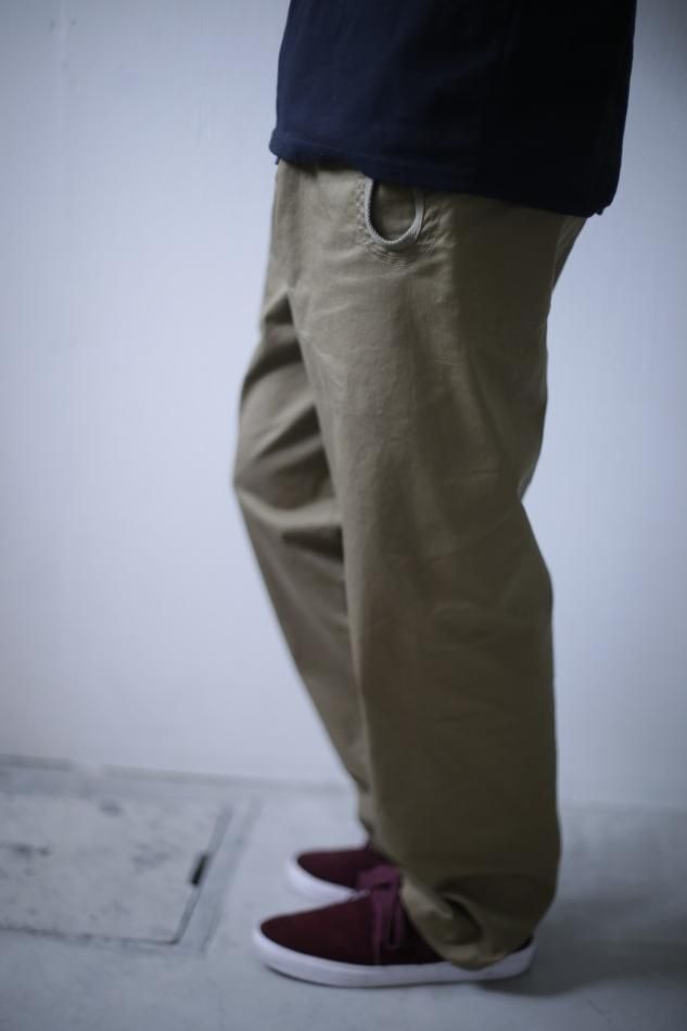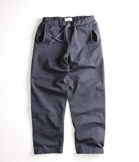 座っても、物が脇にくるので邪魔になりにくいです。シルエットは、少しワイドでストレート。ウエストにはゴムと紐が付き、履き心地の良いストレッチ素材のイージーパンツ仕上げになります。