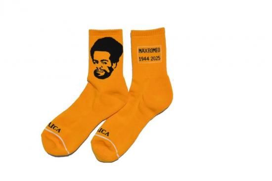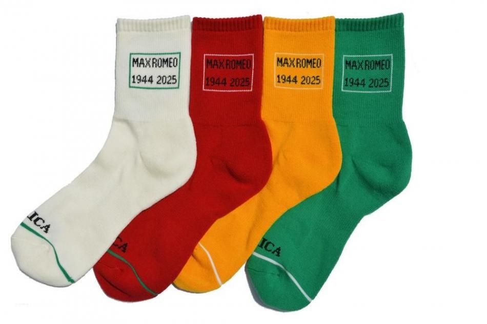 【GUYDANCEさんより】 ”ROMEO 3” Max Romeo(Jamaica人)という歌手が、今年の4月に他界しました。 GUYDANCEはMax Romeoが好きで、以前から彼のソックスを作っています。 そんな彼の訃報をうけ、Max Romeoソックスをまた作りました。(3回目) おそらく世界でMax Romeoソックスを作っているのはうちだけかと思うので。 シリーズ最終回は今までに比べ、Max Romeo顔も大きくなり、細かく表現されています。 Max Romeoに少しでも興味がでれば、ぜひ曲を聴いてみてください。 ソックスの長さは個人差があると思いますが、足首ぐらいのクルーソックス丈になります。 カラーは、WHITE,YELLOW,GREEN,REDの4色展開、価格は¥1,850、税込み¥2,035です。 生地の厚さに関しては、guydanceの標準的な厚みになります。(少し分厚めです) 足の裏からソックス筒部分(足首)の裏側まで、パイル織りになっていますので、 穿き心地も良く、スケート時の外的ダメージ軽減にもなります。